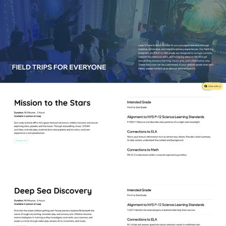 Leap is a learning center in New York offering a homeschool partnership program and enrichment programs to local families. I conceived and directed a suite of immersive learning programs blending early science, sensory storytelling, and the arts. Thematic units—Space Adventures, Ocean Exploration, Animal Habitats, Whispers of the Woodland, Earth Treasures—transformed classrooms into sensory journeys that invited students to learn through project-based play, hands-on STEAM activities, music, and original role play fostering cognitive embodiment. I led all aspects of program delivery from curriculum and experiential design to staff training and operational rollout. The framework I developed became Leap’s blueprint for on-site and off-site field trips and ongoing early-education programming, increasing enrollment and community engagement.